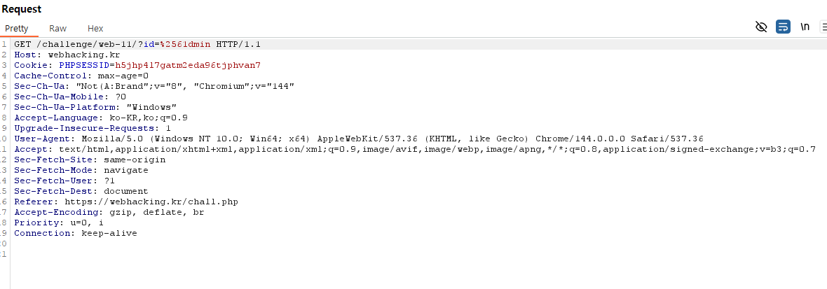 - PHP 서버가 $_GET 입력값을 받을 때 자동으로 한 번 디코딩한다는 점을 고려하여, 필터링은 피하고 최종 비교 값은 "admin"이 되도록 만들어야 한다.