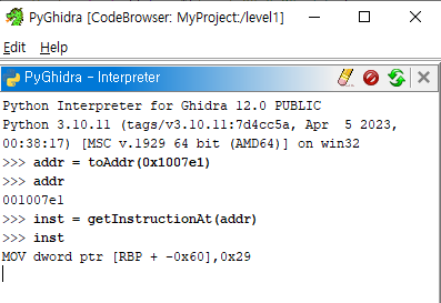 toAddr은 주소 객체를 얻고 getInstructionAt은 지정한 주소의 명령 객체를 얻는다.