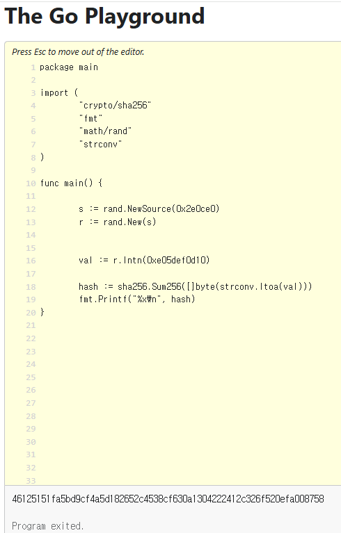 구현하기 위해 go playground에서 시드값과 랜덤값 사이를 넣고 sha로 계산하면 값이 나온다.
