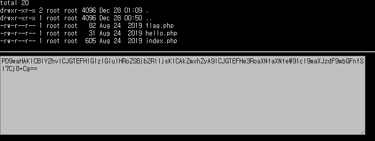 - 이를 우회하기 위해 PHP Wrapper인 php://filter/convert.base64-encode/resource=flag를 사용하여 소스 코드를 실행하지 않고 Base64로 인코딩하여 출력했다.